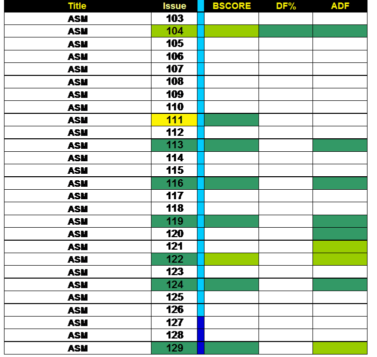 Table 5 is the last bit of data, the Scaled Desire Ranking. I have grouped 4057 issues of comics that I have covered and developed scaled desire rankings. The percentile that an issue occupies gives a wonderful insight into the true value of titles. So we position our title and its key issues in context. A score of 99 means that comic issue is desired at the highest level while 1 percentile is the lowest desired issue. (Green High-Red Low -Yellow staining implies uncertainty- opportunity?)